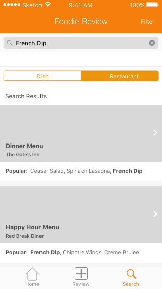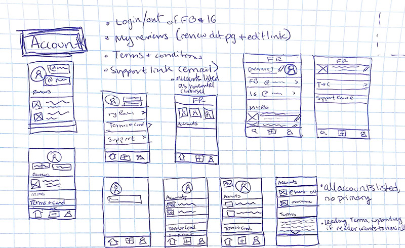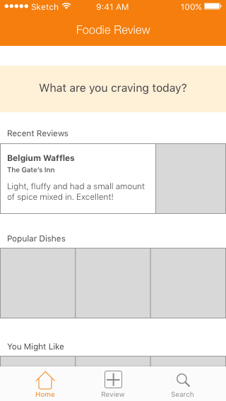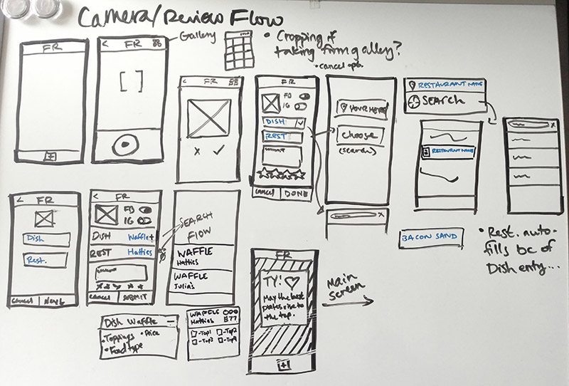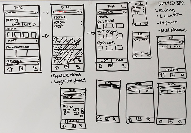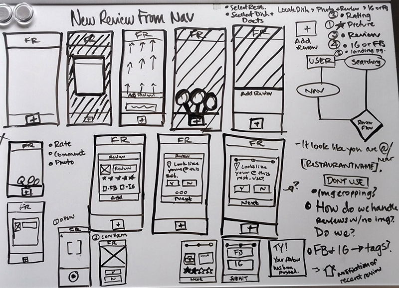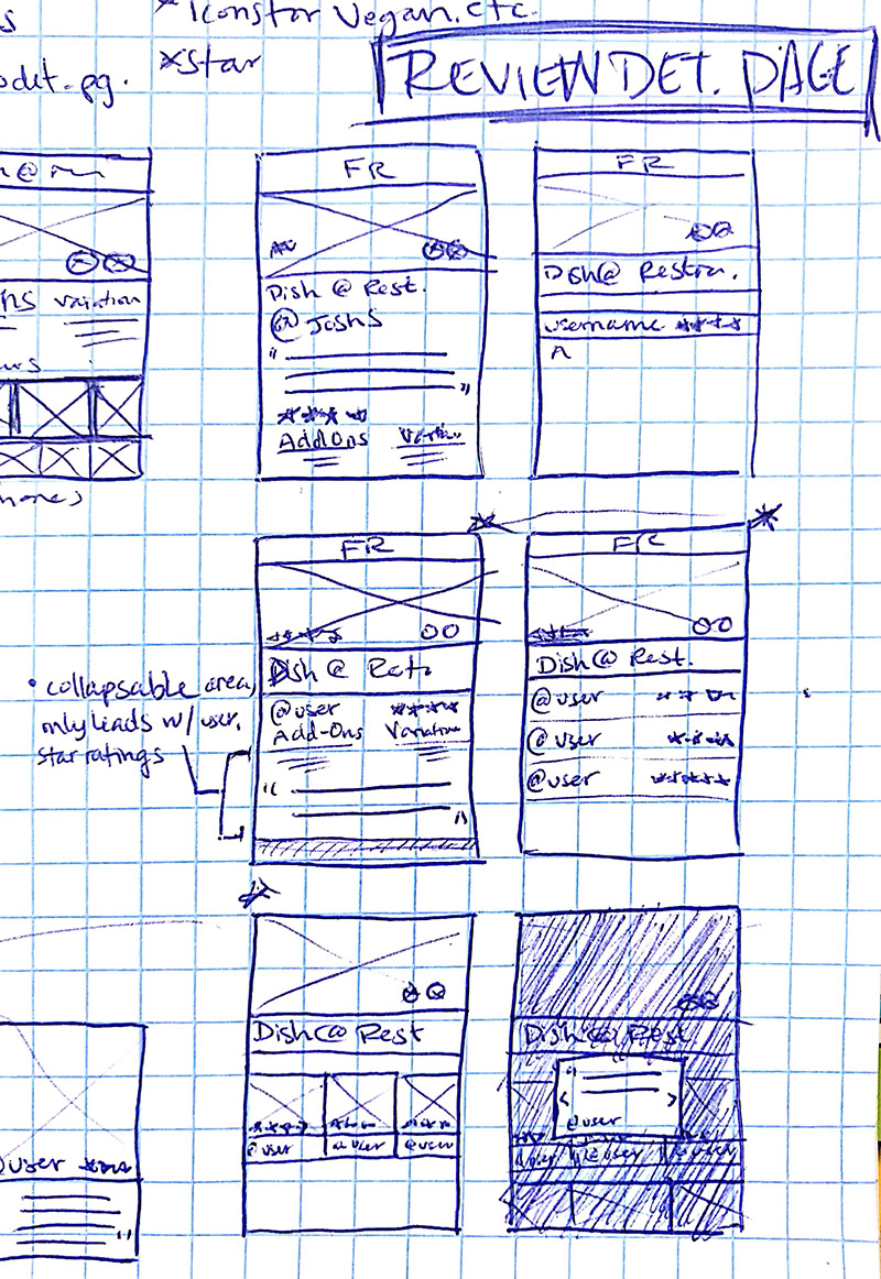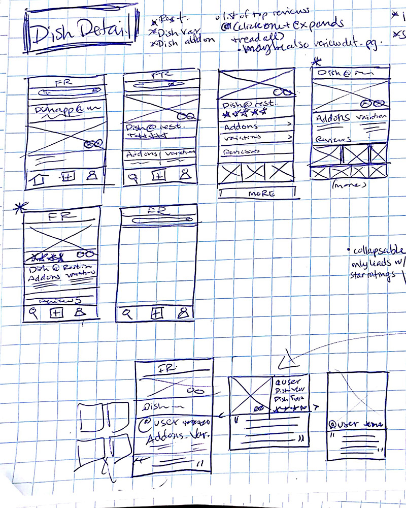 After conducting a Competitive/Comparative Analysis on these apps and their features, I began sketching potential UI directions for Foodie Review. The client and I discussed different flows and features he wanted to see in the final prototype. We narrowed the MVP down to the three primary features of Searching, Reviewing, and Posting.