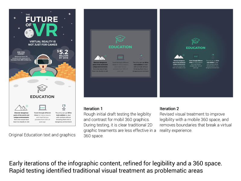 Working with various forms of content for Infographics, Marketing, and Event Promotion, I developed proof of concept solutions using a combination of 2D graphics and 360 imagery.