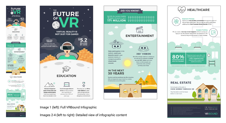 We reached out to VRBound and restructured one of their existing VR graphics about the industry, to fit a 360 mobile space. We shared this with VRBound and through social media, reaching upwards of 3,000+ views. This graphic now has a permanent place on VRBound’s website.